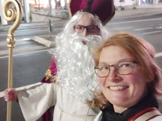 "Überall wo wir hinkamen - ob am und im Kino, dem Restaurant Enchilada, der Oberstadt, dem Basic Coffee oder dem Market, wir wurden freudig begrüßt und standen schon ein bisschen im Rampenlicht.", Sebastian Bleek Pastoralassistent St. Peter und Paul, als Nikolaus der Aktion.